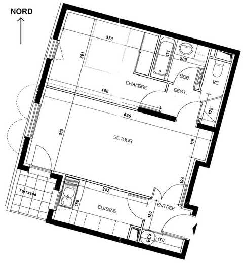 - 2 pièces : salon, cuisine, chambre, salle de bain, WC séparé