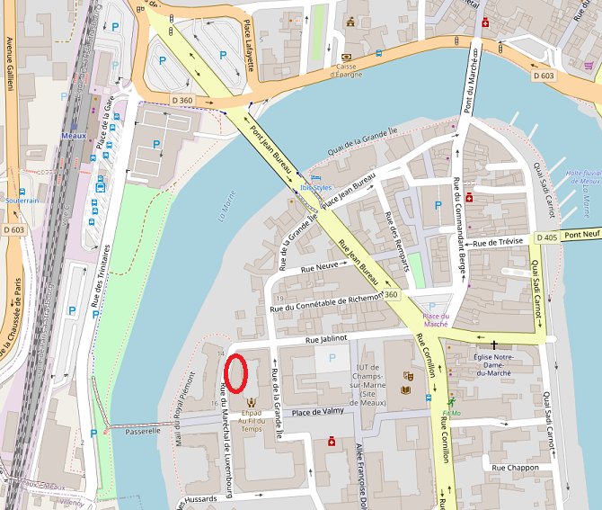 LocalisationAdresse30 rue de la Grande Ile, 77100 Meaux![]() ![]() Transports férrovièreA 7 minutes (par pont voiture ou passerelle piéton) à pied de la gare SNCF, elle-même à 30 minutes de Paris.(Départ tous les quarts d'heure en heure de pointe)