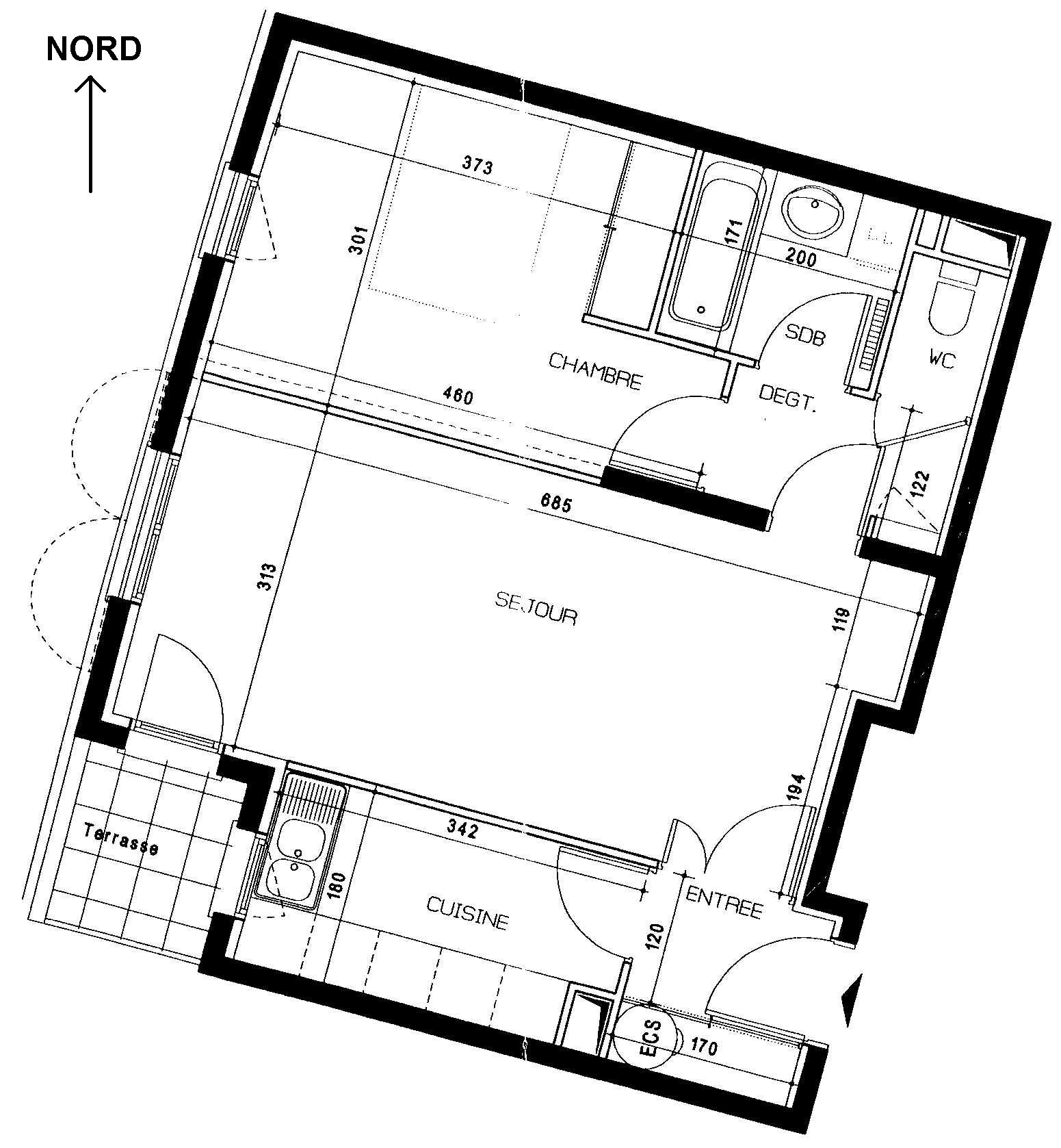 - 2 pièces : salon, cuisine, chambre, salle de bain, WC séparé