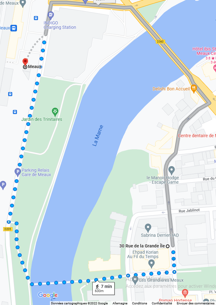 LocalisationAdresse30 rue de la Grande Ile, 77100 Meaux![]() ![]() Transports férrovièreA 7 minutes (par pont voiture ou passerelle piéton) à pied de la gare SNCF, elle-même à 30 minutes de Paris.(Départ tous les quarts d'heure en heure de pointe)